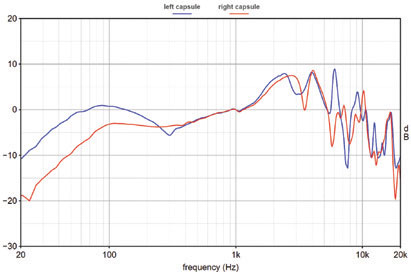Figure 5. Uncorrected frequency responses for the left (blue trace) and right (red trace) capsules of the Audio-Technica ATH-A2000Z closed-back headphone used for the listening .
