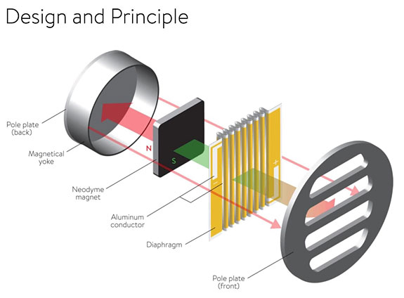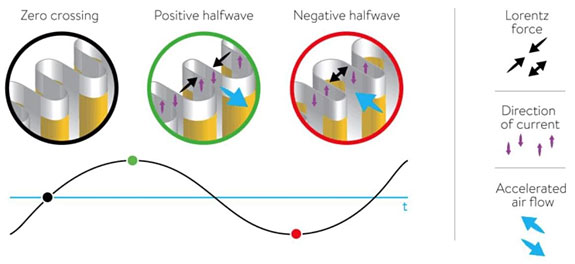 "The Air Motion Transformer is an electromagnetic driver, as it is based on the Lorentz force that moves the air in the single folds. The diaphragm itself has an aluminium circuit printed on it (violet arrows) and is surrounded by a strong magnetic field. The graphics in and around the small circles show the motion of the individual foils producing a sinusoidal waveform: from where it starts (black circle) through the positive (green circle) and negative (red circle) half-waves." -- HEDD The resulting air flow (blue arrows) is four times faster than speed in which the individual folds move, which is a big advantage when it comes to reproducing music signals with fast transients (cymbals, plugged guitar strings, etc.)." -- HEDD