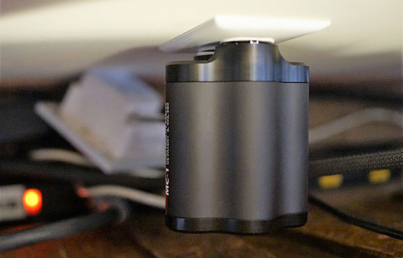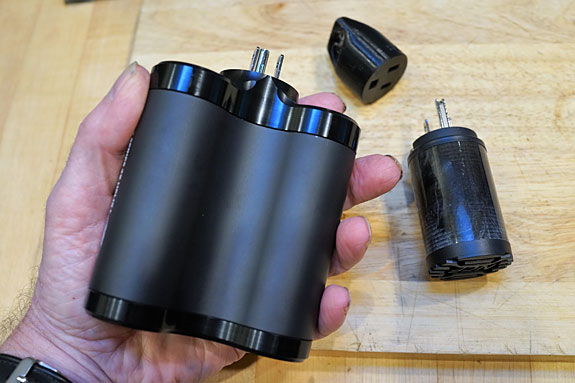 First of all, it's not what you think. It's not a box that conditions your power and has outlets to plug all your gear into. Homeland Security would undoubtedly open your suitcase and take a close look at it if you tried to board a plane. It's a plug-in conditioner that looks like a tactical weapon James Bond might keep handy for blowing up cars or helicopters. I found it works best when plugged into a power strip or into the duplex outlet that your power strip is also plugged into. Rick Schultz was interested in having me review some of his other products after the rave review of his NPS-1260 3D contact enhancer — a spectacular tweak that improved the transparency, resolution, and dynamics of my system. While NPS is related to High Fidelity's other products, their major innovation is their Magnetic Conduction technology that drives the flow of current to the center of a cable, thereby reducing or eliminating the skin effect typical cables have on the music signal. That's the broad simplification anyway. Some would call it cutting-edge technology; others would call it pseudo-science. But that's how science advances — from the absurd to the accepted. Power conditioners in High Fidelity's lexicon are plug-in devices, while what they call power distributors combine their Magnetic Conduction technology with lots of duplex outlets into which you plug your components. I was surprised to learn that their plug-in power conditioners utilize varying industrial-strength versions of what is contained in their soon to be famous NPS 1260 contact enhancer. In typical fashion, in both their power conditioners and their power distributors, the more you pay, the more conditioning and the more outlets you receive. Prices start out reasonable and escalate all the way to NASA level, though High Fidelity does not do any government work. I let Rick suggest a power conditioner for me to review, knowing I had already praised the Furutech NCF plug-in conditioner, a competitor for their entry-level power conditioner. He selected their new top-of-the-line MC-1 Pro Double Helix Plus Signature which I will hereafter refer to as the MC-1 for simplicity, seen here with the much smaller Furutech NCF.