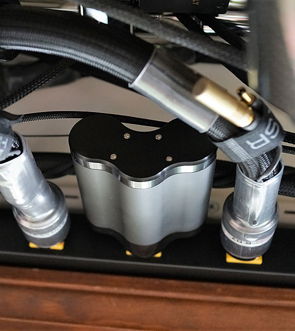 2) All components into the power strip; MC-1 into the power strip. This was the most successful combination to my ear. A layer of subliminal noise was removed and the music emerged from a blacker background with more resolution, tonal color, and transparency. I'm tempted to say that dynamics improved, but the attack of notes was only more prominent because the noise floor had been lowered. The music didn't really get any louder. It just got better. Instruments were more separated from each other on the soundstage and I could hear past the lead guitar, say, and follow the bass and the drums behind it more clearly. Slide guitar and organs, placed to the left or right simply enlarged the soundstage. And backup singers added greater depth and could be heard with greater cognition. Of particular note was that singers and instruments that were front and center became more holographic. This was something that more typically happens for me with LPs, so it was a pleasant surprise to experience this with CDs. Mid-bass, too, down into the mid-30Hz range became noticeably more focused and had more timbre and a lot less thud. That's always been a challenge with the 9" driver in the Kharma in my 6000 cubic foot room. The room never gets fully loaded in the bass, but my mid-field listening triangle (about 9' on each side) helps compensate for the shortcoming of the single woofer. The MC-1 delivered the most tuneful bass I've ever heard from the Kharma with the 18 Wpc 300B monoblocks.
