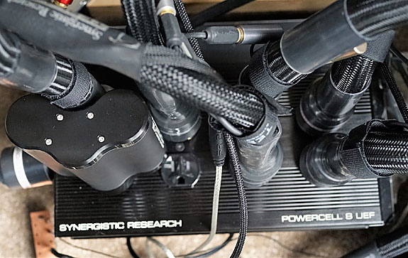 3) All components into the PowerCell 8 SE Transferring all the power cords to the Synergistic Research power conditioner brought the sound quality down a bit. That's not a whole "notch", but when I put on my critical listening ears there were some minor differences. There was a slight loss of transparency and resolution. Tonal color faded slightly. The edges of the notes became a little coarser and when the music got up into the treble the sheen of the cymbals seemed a bit smeared. Some of the cognitive signifiers on my compilation CD were a little less discernable. And the bass notes became less defined, losing a bit of slam and timbre. Of course, this region of the bass is not the forte of 300B tubes. If it sounds like I'm slamming the PowerCell, let me set you straight. The differences are small and given the different form factors of these two conditioners, it is not an apples-to-apples comparison. We'll set that discussion aside until we talk about value, further on.