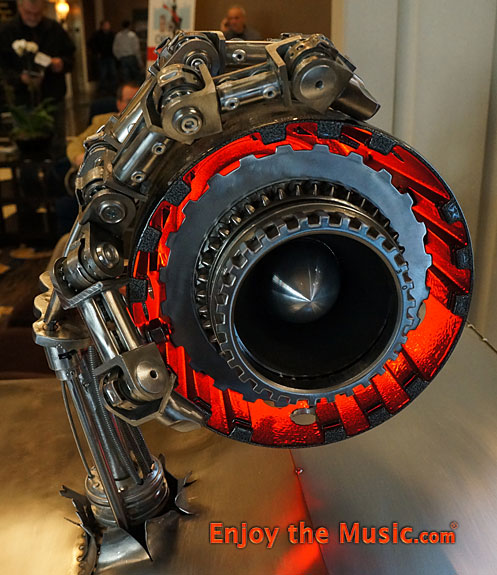 The first thing you see when entering AXPONA are speakers by Mancave Metal. He is simply an artist whilst speaker manufacturer Legacy handles the drivers, crossover work, etc. They make the custom cabinet out of metal... for a mere $70,000.