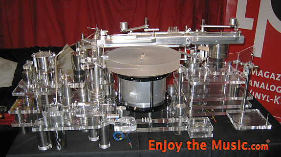 Now imagine yourself an engineer who loves vinyl. You have no life, no wife, plenty of metal fabrication machines and want to build the ultimate vision of what you feel the 'ultimate' turntable should be. The above photo might be what you would construct. Forget the gentleman's name who created it (send me an e-mail and we'll add it), yet this is indeed the #1 Rube Goldberg turntable I've ever seen. "A Rube Goldberg machine is a contraption, invention, device or apparatus that is deliberately over-engineered to perform a simple task in a complicated fashion, generally including a chain reaction."