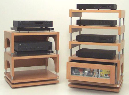 This is a modular rack system, meaning the shelf components stack on top of each other and the system can pretty much be expanded up to the height of your ceiling. If you're homeless the sky's the limit. I've seen some companies use acrylic or glass, which are not exactly known for their strength or resonance-dampening properties, as their material for their shelves. The Hutter's shelves have been designed for low resonance using layers of heavy spruce to dampen vibrations. Many shelves are also stacked upon hollow metal beams, which can be filled with sand to stabilize the rack. This is usually important because many low-resonance materials used in shelving are also intrinsically lightweight. Although the Hutter's design doesn't facilitate sand tweaks, the weight of the shelving is much heavier than your average glass, acrylic, or MDF shelf, and one would suspect the weight that this shelf can safely support is correspondingly higher. Still, I'm not certain I would test this shelf by placing that brand new amp with the dual-mono 150-lb. power supplies and two inch thick lead case on it. Still, the maximum load per shelf is indeed 176 lbs., the maximum load for the total rack 550 lbs. Although the assembly of the rack was, in practice, actually very intuitive, the instructions included with the rack were quite sparse. Hardly one full page (containing large pictures and a lot of blank space) was dedicated to the assembly of the piece. This may sound like a major problem to those of us, myself included, not inclined to working with their hands. Vague instructions notwithstanding, I found the assembly to be pretty easy. It took me less than one hour to assemble. The shelves are connected via four aluminum (nickel-colored, or brass if you choose) rods which slide into pre-cut holes on the two side-pieces of each shelf. These shelves stand on a spiked base, which in turn stands on a base with screw in rubber feet. The only trouble I had assembling this was installing the spikes into the base. The spikes have to be perfectly level or else the shelf will tilt off balance. There are no guidelines on the spikes or any way to determine how far into the base they're supposed to go, so you end up using trial and error to get the spikes perfectly level. Another matter, whose importance may vary from consumer to consumer, is the disassembly of the rack. If you ever plan on moving the thing use great caution. The aluminum rods fit very snugly into the shelving. It's pretty easy to stack the shelves on top of each other and push the rods in, but it is another matter entirely to lift the shelf up and pull the rods out. Included in my evaluation unit was the Racktime's optional CD drawer, which holds 75 CDs. This drawer, especially when full but even empty, is of considerable weight and should be installed below the shelves just above the base. The design of the drawer is elegant and rectangular, blending in perfectly with the rest of the shelf. It is constructed of the same layered spruce as the shelving, and at its front is a glass window reinforced with steel wire. The drawer is available in all of the same finishes as the rack. Sliding open the drawer reveals three rows of 25 aluminum slots set against flat black-painted wood on each wall of the drawer, giving the inside a very slick look in contrast to the rest of the rack's conservative appearance. The build quality of the drawer is among the best I've seen anywhere, and although it holds only 75 CDs it is a very massive drawer. In fact, it ships in its own box of the same size as the other three-quarters of the rack! It's also interesting to note that the CD drawer by itself accounts for over a third the cost of the entire drawer-plus-three-shelves unit. Fully assembled, the rack is an impressive piece of furniture that can be admired by audiophiles and non-audiophiles alike. The build quality of the shelving is excellent, particularly the finish and weight of the wooden shelving components. According to the shipping labels the total shipping weight is 115 lbs., for three shelves and a CD drawer. Aesthetically the shelves are very simple and symmetrical. The look is of a very clean, modern piece with all vertical and horizontal lines. It looks like it was designed by... well... an Austrian architect. The simple, minimalist aesthetics and clearly evident attention Hutter has given to the rack's build quality and finish will be appreciated by all who see this rack. It is definitely a classy piece of furniture that would impress anyone. The blonde maple finish sent to me is probably the perfect choice for the audiophile who wants to assuage the fears of his skeptical wife. The light and bright maple finish, simple design, and heavy, woody looks make this rack seem to slip into a different furniture category; somewhat more like a bookshelf or an end table as opposed to a place to hold your hi fi gear. Indeed, most components and shelves these days have a sterile black or silver look. It's refreshing to see a piece of hi-fi furniture that actually looks like furniture and not just like another piece of gear. The Racktime Basic includes three shelves, spiked base, and CD drawer for $1,639 (or $939 without the drawer). At this price I would say it is a pretty good bargain. Quality wooden shelving can cost many thousands of dollars. Hutter also manufactures a variety of bookshelves, TV stands, and other storage units using a similar modular design. My overall rating for the Hutter Racktime Basic is 75/100, meaning that at its market niche it is a cut above the competition.