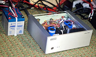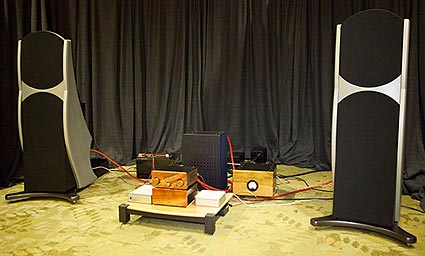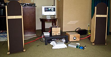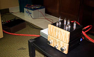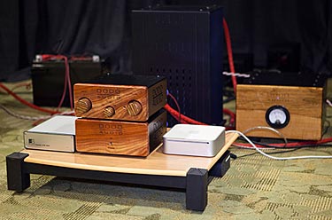 Music was sourced from an Apple computer feeding a dB Audio Labs Tranquility USB DAC into Gary's popular one-tube battery-powered line stage which can accommodate any 12A series nine-pin tube. This line stage is available with a variety of wood species for the faceplate and it is sold as a kit as well. The Dodd amplifier is hybrid class-A with a rated output of 400wpc using early Hitachi mosfet output transistors driven by 5687 twin triodes. Also in use was a small battery powered class-D amp. All electronics that weren't battery-powered were plugged into the Dodd all-passive Balanced Power System.