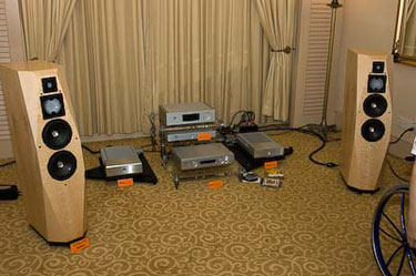 Densen B-400XS CD player, B-200 preamplifier and B-350 monoblocks driving a pair of Focus Audio Master 2.5 floorstanders. Clean power provided by PS Audio Power Plant Premier.