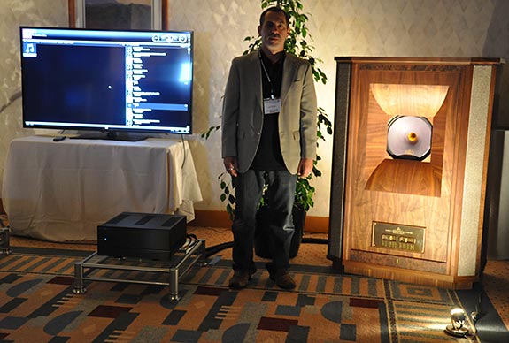 Getting there right when the doors first opened my feet immediately scurried over to the Blue Moon Audio room to visit Len Kinsey. Blue Moon Audio located in Pacifica California, is where I hang out weekly sharing a cup of coffee, talking audio, relaxing and just listening to music with the owner Len, occasionally his wife and even Buffy their dog. Len brought with him the Tannoy Westminister SE loudspeakers ($35,000 a pair) weighing in at 304 lbs each with a 98dB/W/m sensitivity rating. They looked gorgeous and are quite rare to find so if you get a chance to hear them please do. As their web site states, "The 15" Dual Concentric drive unit incorporates an Alnico magnet system with an integral computer designed and manufactured reverse throat high frequency Pepper Pot Wave Guide for exceptional transient response and increased sensitivity. A hard edge' cone surround and unique chassis earthing system deliver tight, fast and controlled bass with fluid and transparent midrange and high frequency performance of great purity."