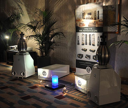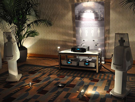 Now what would a show be without a room to display MBL products. Their rooms are known to produce some of the finest sounds around and today would be no exception. Not only did they look and sound wonderful but also came in one of my favorite colors, white. I am a fan of having things a little different, give me white, yellow, red etc. and it puts a smile on my face. Good news, custom colors and finishes are available upon request at an additional cost. As you can see from the pictures the room was setup with two different systems at varying price points. The Corona Line being the least expense and the Reference Lineup filled with the big guns. The Corona series system consisted of the mbl Radialstrahler 120 loudspeakers ($21,400 a pair) and matching stands ($1630 per pair). CDs were played through their C31 model ($9200) with amplification heard from the C32 Stereo Power Amplifier ($9200). The preamplifier in use was their model C11 (with remote control of course) for $8800. For a total system price of $50,230 ($48,600 without matching loudspeaker stands) it was a relative bargain. I mean there are turntables alone that sell for more, without a cartridge. Think about it. If you feel the need to save some more, yet stay within the MBL family you might think to try the C51 integrated amplifier ($11,100) instead of going separate amplifier/preamplifier. That would bring down the total system price down to $41,700 without matching stands or $43,300 with. While not a formal review, timbre accuracy, layering, texture, dynamics all were in line with a system in this price range, that is to say they were excellent.