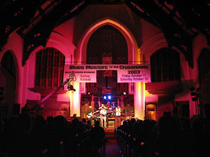 18th, 2003. Once again, Chad Kassem opened the doors of Blue Heaven Studios so that 400 lucky fans of the blues could see and hear some phenomenal artists perform a tremendous range of blues styles each night. The intimate setting and great acoustic of the wooden interior of this old cathedral may be unique among blues festival venues. The concerts started before 7:30 each night and lasted well past midnight. The wildly enthusiastic crowd got the chance to meet the artists up close and personal in the basement of the church throughout the two evenings.