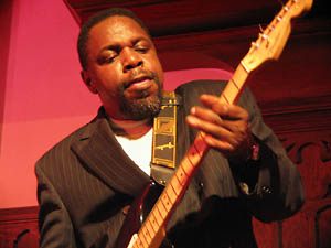Next up, Lurrie Bell sweated up a storm with his brand of rockin', joyful blues. He took a lot of high-energy solos during his set, with Mookie Brill on bass and Willie "Big Eyes" Smith on drums. Lurrie is the son of Carey Bell, and grew up around many of Chicago's blues greats.