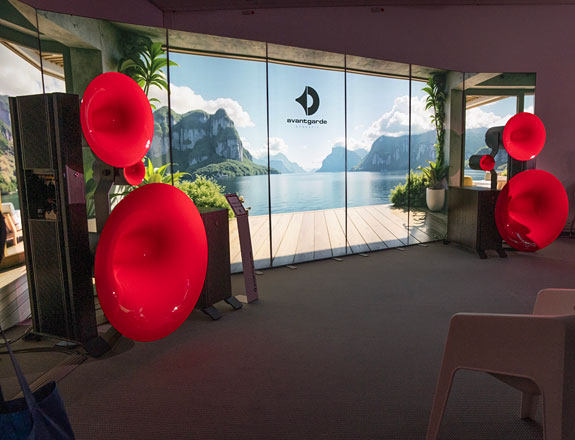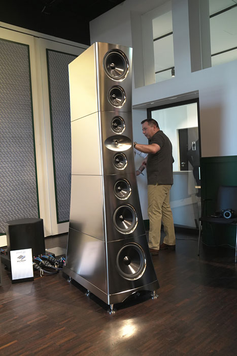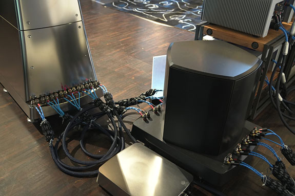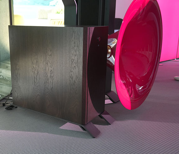Horn specialist Avantgarde Acoustics demonstrated the Twin Sub alongside a pair of Trio G3 horn speakers to an impressively dynamic, fast, and well-extended effect. Horns like these can deliver the first two with ease, but don't do low bass without assistance. Their €46,000 Twin Subs come in a pair with two 12" drivers per side and 1200 Watts of Class D power to keep things in a tight grip. Prince's song Kiss really kicked ass thanks to the combination of speed and weight that this system delivered, I doubt that there was a faster wideband system at the show.