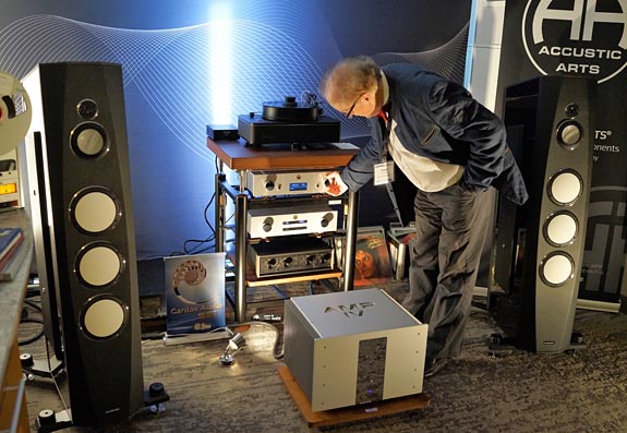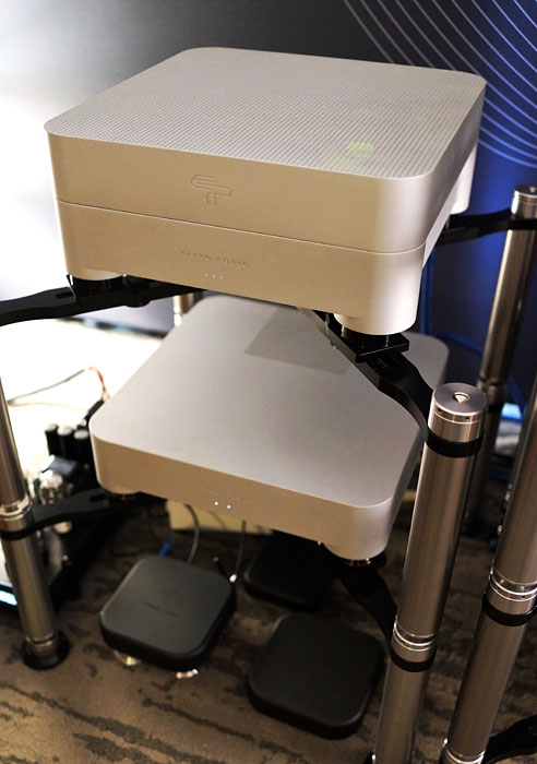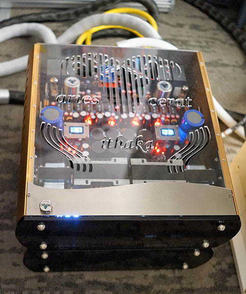 The product line of Aries Cerat, from Cyprus, is vast and comprises several series, all expensive. Their speakers are high-efficiency and require much larger rooms than the sleeping rooms at shows. As you can see in the amp above, the form factors of their products are atypical, appealing to wealthy clients who demand something a little different.