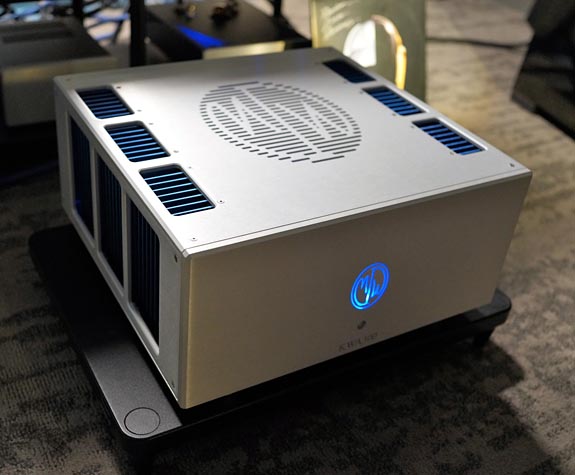 ModWright's signature styling with an engraved logo is appealing, classy, and not overdone. This was the active premier of the KWA 300 stereo power amp, which delivers 300 Wpc @ 8 Ohms (550 Wpc @ 4 Ohms). I love the illuminated blue logo and the anodized blue heat sinks. Very nice.