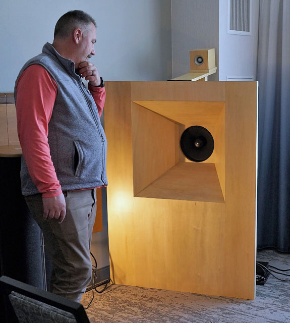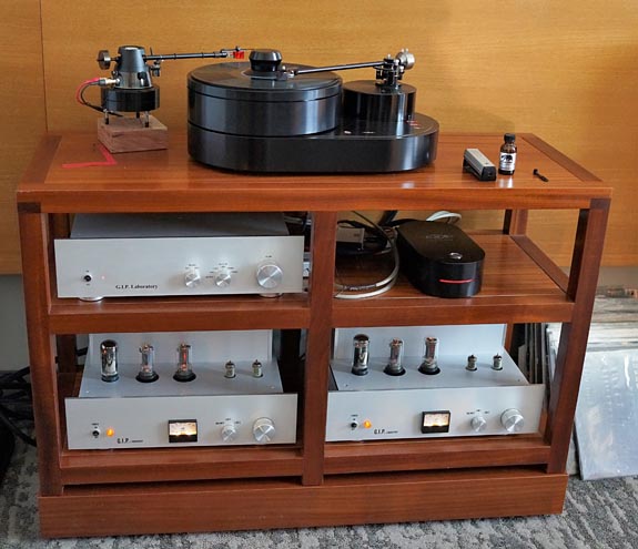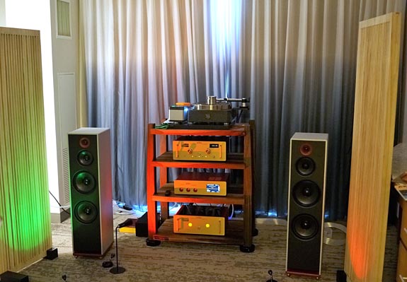 The rig here contained an AMG turntable and G.I.P. Laboratory preamp and monoblocks. They offer monoblocks based on 6L6 and 211 tubes. The rack is from Box Furniture Company and is one of a few I saw throughout the show. The lower shelves, at least, have enough clearance to store LPs vertically.