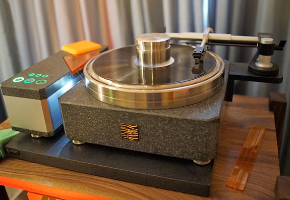 Pure Fidelity seems to be in several rooms at almost every show I attend. This one, finished in a blue curly maple(?) top, was one I wanted to take home just for the finish alone. The turntable beside it was a SOTA Nova VII ($7000 on up), with an internal suspension system.