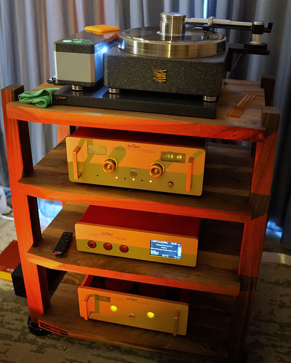 The Massif rack had gloss-black round footers at the bottom—the first time I had seen that. The DarTZeel NHB 18NS preamplifier had an unusual feature. The large knob on the right was labeled "Pleasure" with "more" to the right and "less" to the left. Hmmm. Below was the LHC-208 integrated amplifier, network player, and ultra-high-resolution DAC. On the bottom shelf was the NHB-108 model two stereo power amp putting out 150 Wpc into 8 Ohms and 225 Wpc into 4 Ohms. Coming from Switzerland, the DarTZeel gear is exclusive.