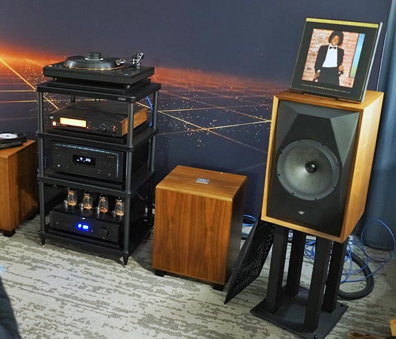 Hegel Music Systems At the Montreal show two weeks earlier, I had the opportunity to hear the new PointSource 888 floorstander ($5k) driven by Hegel Music Systems electronics to very good effect, giving it an Honorable Mention. In a bigger room with a more carefully curated rig, this could be an outstanding loudspeaker. In the room here, I had my first look at the relatively new REL 99 downward-firing subwoofer. The wood finish and absence of a driver staring at me made it very attractive, yet I've seen it pop up on the used market numerous times, suggesting it might not be as outstanding, performance-wise, as their models with forward-facing drivers. It sure looks like very nice furniture, though. On the Solidsteel rack was the new MoFi Electronics MasterDeck turntable, a new model, designed by Alan Perkins, and below it was the MasterPhono phono stage designed by Peter Madnick. Neither of these items is on their website yet, and a lot of items are out of stock because of the tariff situation. (Check their website.) Further down was a Marantz Super Audio CD Player. The tube amp on the bottom shelf probably made the speakers sing. Neither the LP nor the CD was being played, and the seats were all full, so I moved on.