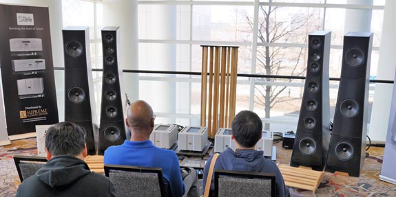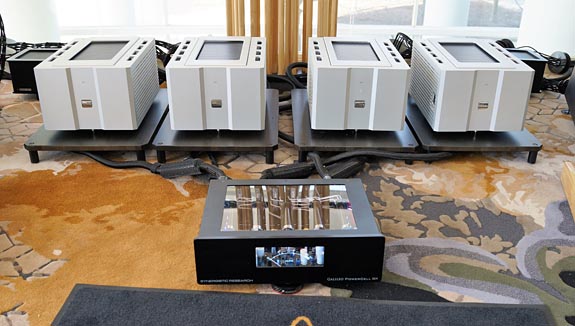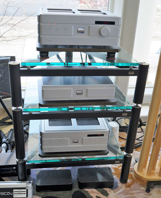 Four large Soulnote amplifiers were connected to a Synergistic Research Galileo PowerCell SX conditioner with Synergistic Research power cords. In the upper corners of the photo were Synergistic's Black Boxes for resonance control of the bass. And against the glass front wall, you can see Synergistic's flagship SRX speaker cables with individual lines running through round discs to keep them spaced apart. Soulnote is relatively new to the US, but it was founded by former employees of Marantz Japan in 2004. Synergistic Research, in the Los Angeles area, needs no introduction.