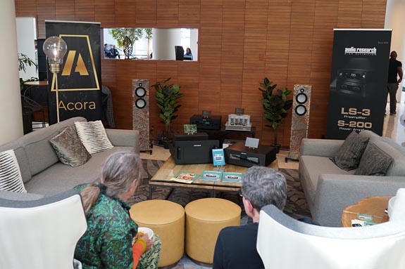 The Audio Research LS-3 preamp was on the top left in the rack, and the S-200 power amp was on the right on the coffee table. An Aurender server was on the bottom right in the rack, and a new I/70 integrated amp in silver was just above it. The rack was from Acora Acoustic and made from black granite, like their top series of speakers.