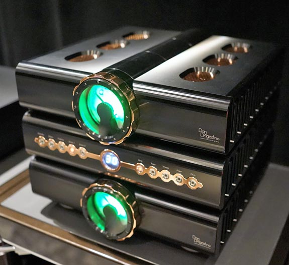 The Clearaudio statement turntable ($300k) with the linear tracking tonearm, fitted with the new Clearaudio Diamond Jubilee MC cartridge ($29k), gets a pass, as it wasn't used during my brief visit. Note the weighted pendulum hanging in the center of the stand, and the control buttons built into the stand.