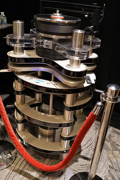 The relatively new Wilson WATT/Puppy speaker was driven by Boulder's new 1151 monoblocks, 1110 preamplifier, and 1108 phono stage. The turntable was a Clearaudio Reference Jubilee with what looked like a Hana Umami Red cartridge on the tonearm. In the shadows, I also noted a DS Audio ION-001 ionizer, designed to eliminate static from the surface of the LP. The digital front end on the bottom shelf was from dCS. The racks were Critical Mass Systems Ultra-Q series, their 3rd tier, and the cable loom was again from Transparent, though probably a more affordable series.