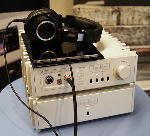 On a side table, perhaps in the hallway, I spotted a Boulder 812 preamp with its headphone inputs exposed that are normally hidden behind a covering plate. It was sitting atop the matching 861 stereo power amp. The headphones in the photo tell us these are not huge components.