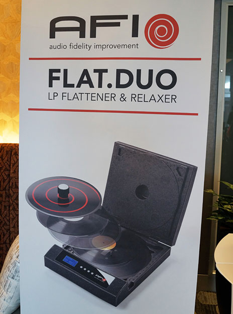 Also on display here was an AFI (Audio Fidelity Improvement) Flat.Duo record flattener/relaxer. The poster gives you a better idea of what it is about than my photo of the component itself. This is an alternative for those not wanting the additional ritual of using a periphery ring on their warped LPs. The record flattener was right next to one of two rigs Quintessence had set up in the large vestibule. With lots of people standing around in that area, I failed to notice it. Dynaudio's new Contour Legacy speakers ($14k), which I believe I heard sounding good at the Montreal show, were driven by Dan D'Agostino's new Pendulum integrated amp ($18k), which includes a phono stage and a DAC. The front end was the new Al Dimeola turntable ($4,900) from Clearaudio. (That's Al as in Alan.) Clearaudio also had their new Smart Double Matrix two-sided record cleaning machine ($3,500) on display. I wish I had seen (and heard) that rcm in action.