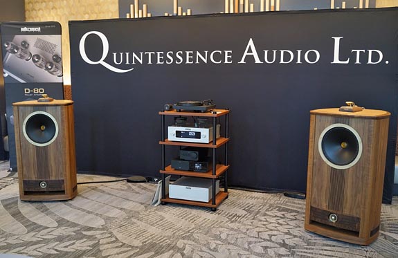 The larger Quintessence system in the vestibule was hard to miss. It featured Fyne Audio's Vintage Fifteen speaker ($40k) driven by an Audio Research LS2 preamp ($8,450) and S200 stereo power amp ($12,950), which are a lot more reasonably priced than we've come to expect from Audio Research. I also noticed the optional Fyne Vintage SuperTrax omni-directional super-tweeter atop the Fyne Fifteen. Even with my vintage hearing, I've experienced an improvement with super tweeters in the past. As spacious as this vestibule is, it is not an optimal listening environment with people milling about and engaged in conversation. I've frequently heard Fyne speakers at the Canadian shows and been impressed with them, though results vary with the amplification and the room setup. I love their styles, which range from classic to contemporary, and the fit and finish. Their high sensitivity opens the door to use with tube amps, a mainstay in my playbook. The front end included a Clearaudio Concept Signature turntable ($5k), which is available in four plinth trims, fitted with a Hana Umami Blue cartridge ($2,500) and a dCS Linea DAC ($29k) for digital music. The little black box on top of the Linea DAC was the Linea Headphone Amp with XLR and 4-pin balanced inputs on the front. The cables were a more affordable loom from Transparent ($12,400), and the Critical Mass Systems rack was the entry-level Gateway model ($6,500).