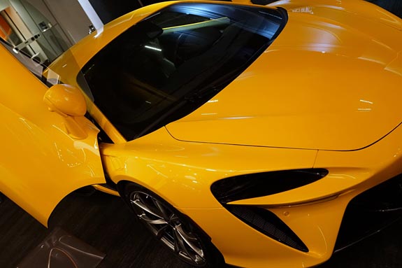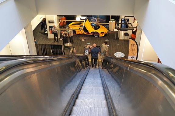 The escalator descends to the lower level, where the medium-sized and large rooms are located. The bright yellow McLaren Artura was parked near the bottom in an attempt to lure visitors away from the truly high end gear they lust for.