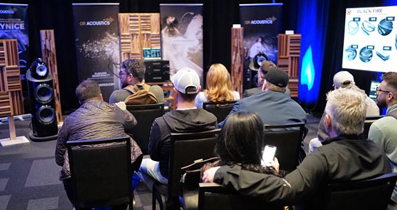 So, DR Acoustics has been a fixture in this room for as long as I can remember. They make cables and power conditioners, and usually assemble a very decent rig. This year, they oriented the rig on the distant short wall and drew an attentive crowd with the B&W flagship speakers. They installed several large wood diffusers to keep the room from being overdamped.