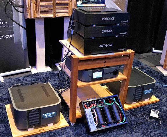 The electronics were the Classé Delta series preamp and monoblocks that have been shown with the B&W speakers in previous years. DR Acoustics manufactures the power cords supplied with Classé Delta amps and has a series of cables designed at that level. The Polynice is their Power Management & Virtual Ground System ($5,995 / $4,995 show special). The Antigone 3.0 is a Power Management System & Virtual Ground System ($8,995/$7595 show special). The Cronos is something so new it's not yet on their website.