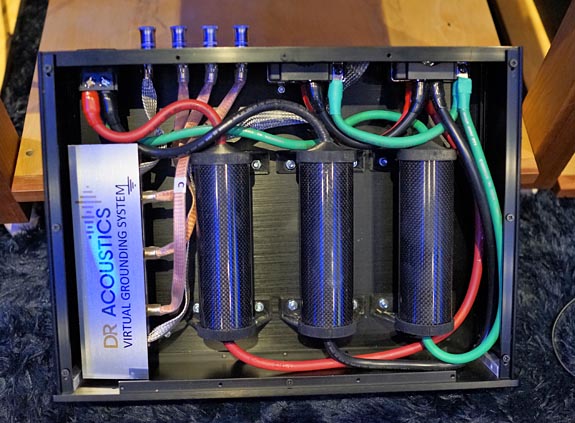 Here is a look inside the Polynice grounding component. I covered this in more detail last year, and there is plenty about it on their website. The four bluish inputs on the rear are for ground wires, and the grounding unit is hidden under the white signage. I believe those are silver braided ground cables leading to the ground unit. Splitter cables are available if you need to ground more than four components. It is a substantial unit, to say the least.