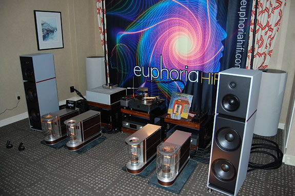 Euphoria had two rooms at the show. The one that caught my attention featured Stenheim 5SE loudspeakers ($76,500), CS Port 212PAM2 Monoblock amplifiers (two sets for vertical bi-wire) ($75,000 a pair), CS Port C3PR Preamp ($24,000), CS Port C3EQM2 (battery) Phono preamp ($15,000), CS Port TAT1M2 Turntable ($50,000)...