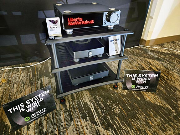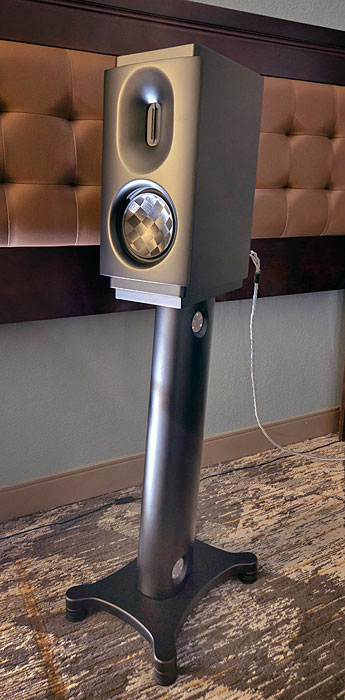 Room 415 – Chesky Audio The LC1 uses a 10-inch tall, 8-inch wide, and 10-inch-deep multi-layer high-mass non-resonant cabinet. They feature a one-inch dome tweeter with surrounding diffraction control, and a 6.5" mid-bass driver mounted on its small front baffle, with a pair of inertially balanced, 8-inch, fluid-coupled, passive radiating subwoofers mounted on the left and right-side baffles. Its crossover is hardwired using silver-solder, featuring Solen film capacitors, and internal wiring from Kimber. Recommended power is a minimum of 30 Watts at 8 Ohms, and the LC1s are sold singly, at $498 each, or $996 a pair. Driven by only the affordable Cambridge Audio EXA100, a 100 WPC integrated amplifier that includes a Roon endpoint and built-in high-performance ESS Sabre ES9018K2M based DAC, the whole system was hitched together using AudioQuest's entry-level Rocket cables. While no price was given for the speaker stands, this whole system comes in at well under four grand, all-in. Sources: Electronics: Loudspeakers: Ancillaries And Cables