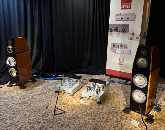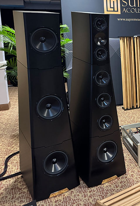 Reviewed by everyone and their sister-in-law is the SVS brand Ultra Pinnacle Evolution large floorstanding loudspeakers ($500 per pair). As expected, you have time alignment, diamond tweeters, and a big sound down to 16 Hz. Field reports say they also have excellent imaging, though be aware they are a low-ish 88dB/W/m sensitive and present a more challenging 6 Ohm load to your amplification. Also on demonstration was an SVS two-way design at $1200 per pair.