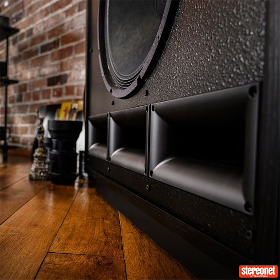 The name Cornwall derives from the speaker's suitability to be placed in a corner or against a wall, rather than being a tribute to a popular holiday destination in England. The MDF cabinet measures 38 x 25.3 x 15.5 inches (960 x 630 x 390 mm) and weighs around 96 lbs, or 43 kgs. One reason for its great weight is the driver complement. There are three: a massive 15 inch K-33 composite-cone woofer, a 1.75-inch K-702 midrange compression-driver with patented 'Mumps' technology Tractrix horn, and a one-inch K-107 titanium diaphragm tweeter with an all-new wide-dispersion phase plug.