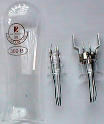 The late Dr. Riccardo Kron, KR Audio's progenitor, was an ardent proponent of the use of Simax brand glass (manufactured in the Czech Republic) for tube envelopes. This is a hard borosilicate glass (similar in composition to Pyrex) that is used in applications which place the highest demands on heat resistance and chemical stability. It is corrosion resistant even at temperatures up to 300°C, and is the glass type of choice for glassblowing of scientific apparatus. Its use in tube manufacturing ensures the maintenance of a high vacuum and long-term stability. Mr. Gencev, KR Audio's product engineer, points out that while standard commercial soft glass is cheaper and eminently suitable to mass production because of its low softening point, it cannot be reliably employed for hand production. The original WE 300B used soda-lime soft glass for the envelope and a lead type glass in the tube stem due to its higher electrical resistivity.
