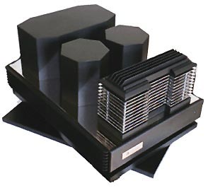 What if you could get more power from a 300B and keep the whole thing in class A configuration and use only one tube per channel? There is an answer. Drive 550 or more volts through the KR300BXLS tube and heat sink the devil out of it. Now we are talking about 14 watts of 300B power with a tube that has 65 watts of plate dissipation and 32 cathodes! Kron calls it the Vacuum transducer. It is a mixture of the brute 300BXLS tube and pounds of aluminum wrapped around it. The 300BXLS is a remarkable tube and is a drop in replacement for most 300B applications. If your amplifier does not have the extra voltage that the 300BXLS can accept then it will simply behave as an eight watt 300B tube. KR has a very in depth write-up of this tube on the Welborne Labs website. Upon receiving the Antares, loaded by fork truck into my sport utility vehicle, it is packaged in a wooden crate with rope handles screwed together and secured in thick shock absorbent foam. Unit arrived in perfect condition due to the superior packaging. The unit is very robust and solid while construction is absolutely stunning. Black Power transformer housing, black output transformers (2) and heat sink unit (vacuum transducer) appear around the two KR 300 BXLS vacuum tubes. A chromed base plate, side panels in black with fins and spiked feet with platforms (3) round out the units' superb construction. Built like a battleship in my opinion. A LED (light emitting diode signals protection cycle in red for the first 35 seconds of turn on and then turns green upon stability of the entire circuitry mounted on the front panel right. I mentioned before how the Antares is packaged. We are talking about a very large wooden crate, rope handles and yes, this amplifier is "only" 14 watts per channel weighing a mighty 105.1 lbs.! We are talking serious build here with most of the weight in power and output transformers, which are Kron design. What a beast! Hefting this amplifier out of the crate takes serious Kahunas!