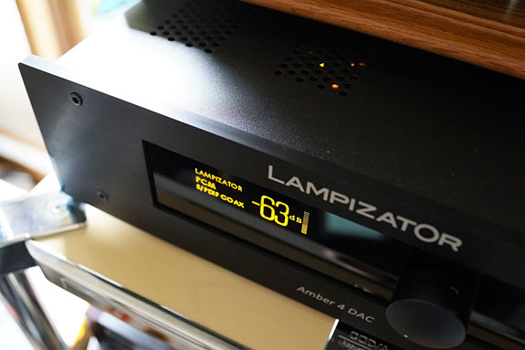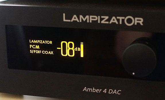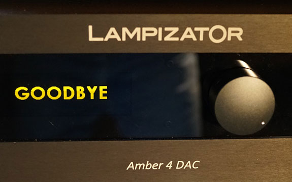 There is also the possibility of running directly to your power amps if the Amber 4 is ordered with volume control as the review sample was provided. Going this route gets you the large screen which greets you with "Welcome" at turn-on and "Goodbye" when you shut it down. Shades of artificial intelligence? There is also a knob on the front that controls the volume and will switch inputs when you push it in and rotate it. Large yellow numbers will read out from "0" to –63dB, indicating 1dB variations in volume. There is also a vertical bar just to the right of the number to indicate the relative volume of the setting. There is labeling on the left side of the screen to remind you this is a LampizatOr, as well as an indication of the input in use and the nature of the signal — PCM/DSD, though it did not indicate the sampling rate of music being played.