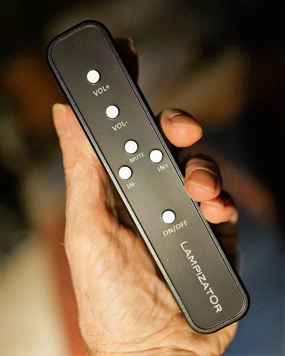 The remote control is quite addictive. At about 1.25" wide, a touch over 6" long, and 0.75" thick, it is a perfect size. It is made out of machined and anodized aluminum and has four tacky plastic feet that keep it from sliding on smooth table surfaces or the leather arm of your listening chair. The rounded corners and softened edges will not likely cut into cloth or scratch your leather chair. The six buttons control the volume, mute, input selection, and power and are arranged in a logical, easy-to-remember configuration.