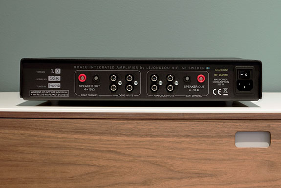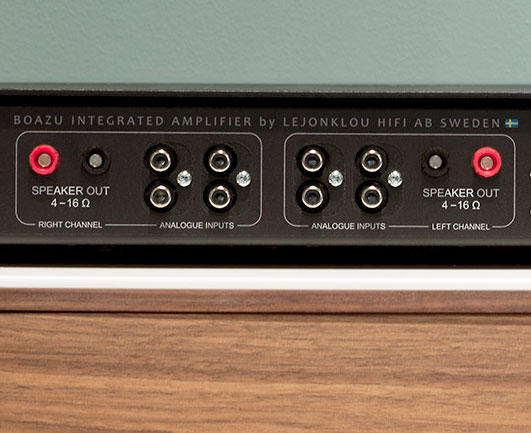 Integrated Amplifier Arrival The rear of Lejonklou's Boazu continues the minimalist theme. There are four unbalanced RCA inputs, no pre-out and no provisions for balanced XLR interconnects. The inputs are not identified by their potential use, and all are on all the time. In an early prototype of the Boazu a switch was provided to identify which source was being actively engaged. Fredrik found that this approach had a deleterious impact on the sound of the Boazu and the current approach found its way into all production Boazu solid-state stereo integrated amplifiers. You can place whatever source into whichever inputs you like and only the input you are actively playing will produce sound through the system. Problems emerge only if you play two or more components at once, for example, a turntable and streamer. Since one would hope this would happen only in error, the approach works just fine. Besides the four inputs, the back panel was graced with the power switch, input for a non-dedicated power cord plus one set of loudspeaker outputs that can work with banana plugs or with special connectors available through Lejonklou. Banana plugs are prohibited in the European Union, but not elsewhere, and since Connecticut has not yet applied for membership in the EU I used loudspeaker cables terminated with banana plugs. Though the power cord connection is non-dedicated, the Boazu comes with Lejonklou's preferred power cord you are strongly encouraged to employ – again Fredrik having tested many alternatives, and to this point, the one provided prevails sonically within my stereo sound system. The cord is not dedicated, I presume, because testing is ongoing in all models, each of which is designed to be fully upgradeable and so should Fredrik find a better power cord (sonically speaking), the owner of any model will be able to upgrade to the new cord without other physical changes having to be made to the unit. The absence of a pre-out means that there is no way of easily using the preamplifier section of the Boazu with another amplifier, even one driving active (sub)woofers. Finally, the Lejonklou Boazu inverts phase, which it resolves for at the speaker output where the black plug is live and the red ground. Turning the power switch on sets the light above the name aflutter. After flashing for six seconds, a green light goes on and the volume is set to default of 40dB. Thereafter volume can be controlled by either the buttons or by the serviceable remote.