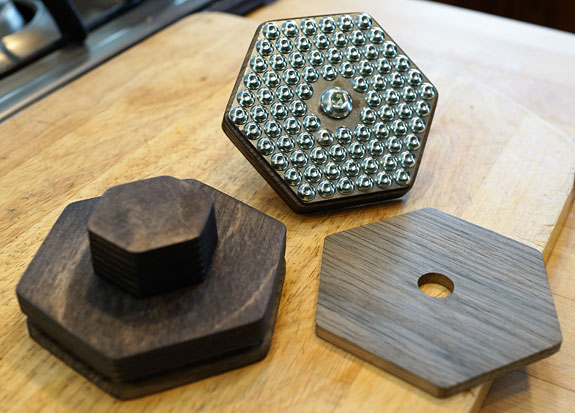 At first glance, they look like something fabricated in a high school shop class with 84 chrome-plated small Allen head machine screws binding a metal plate to a hexagonal piece of high-quality plywood, topped with a hexagonal plywood knob. A large center screw centers the footer on an identically sized thinner piece of solid wood. Presumably, the different layers of different materials act as a constrained layer damping device with micro-vibrations further filtered through the dome-topped screws. My review samples had a thin layer of solid wood as the bottom piece, but current versions are bored with dimples that mate precisely with the 84 screw heads. And the cost? A whopping $224 apiece! (5% off for two or more and 10% off for four or more) While the materials may seem affordable, the build cost is likely very high. With the discount, that works out to about $639 for a set of three. While I have a variety of footers, mostly I use Synergistic Research MiG footers ($149, set of 3) and MiG 2.0 footers ($249, set of three) but these sit on a Codia Acoustic Design rack with shelves made from a South Korean version of Panzerholz with a vibration-absorbing resonator in the center. These shelves provide substantial damping by themselves. I also have a set of Synergistic Research MiG SX footers ($995, set of three) which I use under my DAC and keep as a reference. These incorporate several high-tech components in a sophisticated design. That said, the Bindbreaker footers outperformed the MiG SX and I expect the current version with the dimpled bottom plate will yield an even higher resolution. They are rather humble looking, but they performed astonishingly well throughout the audible spectrum with my DAC. After trying them under the DAC (which is a 95% solid block of aluminum and 5% electronics) with great success, I tried them under a new Charisma Audio Musiko turntable which is finished in piano gloss black, top and bottom with Sorbothane half-spheres for feet. The very smoothly finished Bindbreaker wood surfaces were no threat to either the piano gloss finish or the solid oak wall-mounted shelf on which the turntable rests. The results were a slight improvement, but less inspiring with the turntable. This was probably due to the heavy (possibly Panzerholz) layers of the turntable plinth which were already very effective at reducing vibration. [Review forthcoming.] I also tried the Bindbreakers under my Coincident Statement Line Stage that sports an internally suspended socket for the 101D vacuum tubes. The results here were disappointing with the Bindbreakers sucking the bloom out of the music and diminishing some of the transparency in the process. Tonal color saturation dropped a bit, too. These features are very beneficial in creating the synergy between this line stage and the AGD Audion GaNFET Class D monoblocks. It's not uncommon for the performance of footers to vary depending on the component and the shelf on which it rests. My anecdotal sampling here suggests the Bindbreaker may work best with solid-state gear, but you have to try it with your gear. When it works, it works very well.