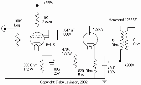 Circuit Design The easiest way to design is from output to input. With that in mind, the first thing to do when designing an amp like this is to choose an operating point for the output tube (technically you start with the speaker, but I am assuming a standard 8-ohm speaker). The tube data for the 12B4A from Duncan Amps suggests an operating point of 150V on the plate and 35mA with bias set at -17.5V. The plate impedance at this point is about 1.3k ohms. There is a rule of thumb that says you should pick a load impedance that is approximately 2.5-3.5 times the plate impedance at idle. Since the plate impedance varies wildly with the AC swing of music (this is just a suggestion). After looking at the tube curves, I decided a slightly better operating point would be at 180V on the plate, 27mA and a bias of -23V. This would produce about 1.56 watts when using a 5K ohm load, with just about the same distortion level that the suggested operating point gives. The easiest way to set this up is with cathode (auto) bias. Ohm's Law says that to get -23V drop with 27mA, therefore I need an 850 ohm cathode resistor. This resistor will dissipate about 0.6 watts. It is always best to underrate your components, so I decided on a 2 watt part. I had some 820 ohm, 3 watt resistors on hand - which is close enough to 850 ohms. In fact, that only moved the bias to about -22.5V, so that is not a problem. This resistor needs to be bypassed with a capacitor to maintain the correct gain and output power. This cap works out to around 50uF, and should be rated at least 50V. Any calculations that I do not mention and you are curious about, please e-mail me about them and ask. Now, on the other side of the tube, we need a plate load. Since I decided on a 5K load, we needed an output transformer for that. The Hammond 125BSE seemed like a good choice. It can handle up to 45mA of bias current - and I am using approximately 27mA. So this output transformer will work. I bought mine from Angela Instruments. The last thing we need for the output stage now is a grid leak resistor and DC blocking cap. This resistor is generally best made as large as possible. Max rating for the 12B4A is 1Mohm. I will use a 470k 1/2 watt metal film resistor cause I have quite a few of those. The cap is unnecessary is you are going with a direct coupled design. However that would require some changes to the voltage points. The cap and the grid leak resistor form an RC high pass filter, so we need to be careful what size cap we use. It is generally a good idea to pick a nice low frequency cutoff for the high pass filter. I used 5Hz - and the cap works out to around .047uF. For this I will use an inexpensive Sprauge Orange Drop, which can usually be had for around $1. (My favorite coupling cap these days is the AuriCap, and in this value would be around $6 each - I may switch some in later on.) Now we need a driver stage. The driver needs to do two things: First, it needs to provide enough voltage swing to drive the output stage to full output. Second, it needs to provide enough current to overcome the interelectrode capacitances of the power tube. The first requirement is easy to figure out. If we want to drive the output tube to full power, we need a AC voltage swing that is double the bias voltage. In this case, the 12B4A's grid is at -23V, thus we need the driver stage to swing 46 volts. Now to determine how much current we need, calculate the slew rate the output tube needs to overcome its capacitances. Roughly speaking, this works out to about 2mA for the 12B4A. Any driver with at least this much bias current will do. Now to pick a tube that can do this. I have a bunch of signal tubes that could be used on hand, it is just a matter of deciding which one. The 12AX7 is ruled out. It will swing 100 volts (that is way too much), at a max of 2 mA. We need some more leeway than that. A standard twin-triode as found in many pre-amplifiers will do, such as the 12AU7 or 6DJ8. However, since I am using such an unusual output tube, why not use an unusual driver tube? Lets go with the 6AU6. The 6AU6 is a small RF pentode in a 7-pin miniature envelope. Its intended use is in tuner sections. It is entirely unsuitable as a driver when used as a pentode - however when wired as a triode (screen and suppressor both tied to the plate) it makes a fantastic voltage amplifier. I am running the 6AU6 at around 220V on the plate, 12mA plate current, and -4V bias. The bias is set to -4V so that the 2V output from a CD player wont clip the input. The 6AU6 is set up with a 10K load resistor and a 330 ohm cathode resistor. The load resistor will dissipate about 1.5 watts, so I have a 5 watt resistor in place. At this operating point, the 6AU6 is providing about 50 volts of swing, which is just over the 46 volts we need for the 12B4A's full output. This means the driver wont clip before the output stage clips - a good thing. Stick a 100k ohm log taper pot on the grid of the 6AU6 for a volume control and that part is done. All this can be seen in the below schematic.