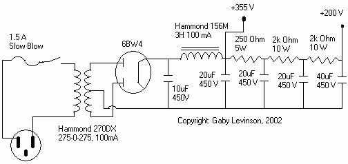Power Supply The next thing that needs to be designed is the power supply. Since this amplifier is rather simple to begin with, a simple power supply is in order. The maximum voltage needed is around 350, used as the B+ for the driver stage. This works out to a transformer voltage of around 275. I selected the Hammond 270DX, which will give 275V at 90mA, center tapped, and has a 6.3V, 3A winding for the heaters. I had a 6BW4 (9-pin) full wave rectifier in my tube stash, so I will use that one. The output of the 6BW4 is sent into a CLCRCRCRC filter using a 10uF capacitor, a Hammond 156M choke, and then a JJ 20/20/20/40 can-type capacitor. The B+ for the driver is taken from the first 20uF cap. The B+ for the 12B4A is taken off the 40uF cap. The schematic can be seen in the below schematic.