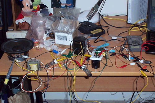 The Real Test I was fully expecting this thing to sound like absolute junk. After all, its clip leaded together, and it was a circuit I just thought up in my head. But boy was I wrong! This 1.5 watt flea powered amplifier sings! Its missing a touch of refinement that my 300B monoblock amplifiers have, but it certainly sounds like a single-ended triode amplifier. And yea, its only 1.5 watts... though my loudspeakers are efficient enough. I found myself groovin' at quite a decent volume with my 97dB horns. It had all those nice qualities like pacing and timing. Qualities I find lacking in some commercial tube amplifiers (perhaps the manufactures want to over-emphasize the 'tube sound' and end up making it sound ooey-gooey?). In fact, this amplifier sounds downright wonderful. This mess of clip leads sounded nice and fast, yet smooth. It will not play extreme loud, but within its useable volume range with is quite nice. Now I just need to find a tube that sounds like this wonderful indirectly heated triode that can give me a few more watts. This is one fun little tube! Now all that's left is to build a chassis for it and do the final construction, and the all important critical listening test. Tune in next month for part 2 to see how this project comes out. Need some "office" speakers to go with this little "office" amplifier? Look for an upcoming article on a matching speaker...