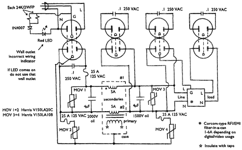That completes the description of the placement of the major filter elements. A 0.1uF 250 VAC UL approved capacitor should be wired directly across each outlet. Wrap the leads CCW around the screw terminals. Tightening the screws will then tend to loosen the tension on the capacitor leads, rather than pulling the leads off the capacitor.