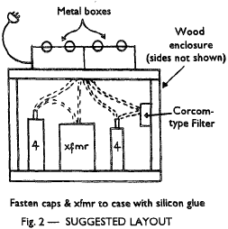 The next element is the high amperage, dual secondary transformer. This gets wired as a common-mode choke with one secondary winding in series with the line, and the other secondary in series with the neutral. Both secondaries have to be wired in-phase (see "how to" diagram to the eight). The primary will not be used and should be well insulated with electrical tape to prevent accidents. There will be some leakage between the secondaries and the case of the transformer, so ground the case. The third element is 2 to 4 uFs of 1500 to 2000 Volt oil capacitors. This voltage rating can be slightly lower than in the first stage because transient spikes will be reduced first by the MOV across the first filter element and second by the choke. Two or more duplex outlets across this filter will provide power for preamps, tuners, analog tape decks, etc. An optional fourth filter element will further clean up and isolate "things". A surplus Corcom-type filter can be wired to the third filter element or, if you already have one, a Tripplite can be plugged into one of the outlets across the third filter element. Surplus filters come in many shapes, sizes, and amperage ratings. If you are not ignoring the convenience of digital and have a CD player, then almost any Corcom-type filter will work. If you have an extensive video set-up, then use a 3 to 6 Ampere filter, or use a Tripplite plugged into one of the outlets wired across the third element. Mount the surplus Corcom-type filter to the wooden box. Use two filters if you have both digital and video. This keeps the one from interfering with the other, and both of them from interfering with your analog.