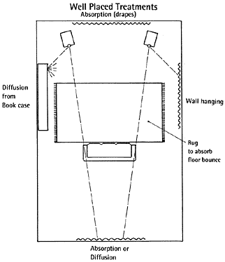 Remember, too, that "room treatments" don't necessarily need to be things built or designed for that specific purpose. Carpets and wall-hangings, room dividers, draperies, and vertical Venetian blinds (set their angle to make them variable reflectors), if properly placed – even where there's no window for them to cover – can be nearly as effective, while often costing less and adding to the beauty of your room. Broad-leafed plants (Fiddle-leaf fig trees are among my favorites) can be excellent sound diffusers, and can be used to good effect in corners and other critical spots in your room. And the best part is that, for sonic effect, they don't even need to be real, so no maintenance or watering is ever required.