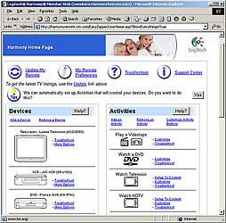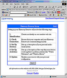 The Harmony H688 remote, like other Harmony remotes is designed to be usable and programmable by just about anyone. Instead of just a simple replacement for your current remote controls, the 688 is set up to perform common "activities' which take care of all the details involved in a complicated home theater system to accomplish specific tasks. An activity like "Watch a DVD' might require that the DVD player be powered up, the TV be powered up and switched to the appropriate input, and the home theater preamp or receiver be powered up and set to the appropriate input. And after all that is done, let's make sure that the Volume buttons still operate the preamp, while the transport buttons operate the DVD player. A series of "hard buttons" (which actually have a nice comfortable cell-phone-like feel) operate common functions like channel up/down volume up/down, play, rewind, etc. More elaborate functions like timer programming are buried within a scrollable menu that uses the remote's small LCD screen. Unlike traditional universal remotes, which either require you to point your remote at the ass-end of the new remote to painstakingly program in all the functions one button at a time, or to punch in arcane codes for your manufacturer and device, the Harmony takes care of all programming of your remote on their Web site. Plug your remote into your computer with the attached USB cable, go to the Harmony web site, select your components and you're in business. At least that's the theory... Reality for me was a little different. Upon opening the box, I found the remote, a USB cable, 4 batteries, a software CD and a user manual. I decided I would try this without opening the manual, and just see how far I could get on my own. After all, I'm pretty handy with technology. How hard could it be? Answer? Not hard at all! To get started anyway... The CD had an auto-run file, so just putting it into the computer loads the installation program. After a couple of clicks, the installation was complete, and a page on the Harmony Remote website opened automatically: