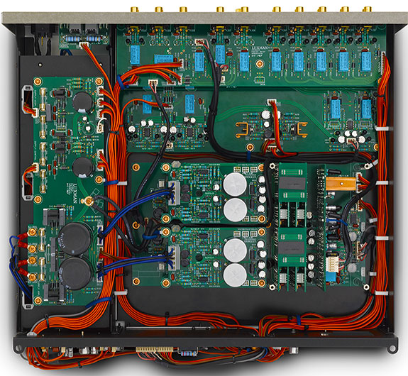 Despite Luxman calling the C-700u a control amplifier, it does indeed have many functions of a preamplifier of yore, most notably tone controls, which thankfully one can bypass using a small pushbutton on the unit's front panel labeled "Line Straight", which was activated 99% of the time the unit was in my system. The other one percent was when I fooled with the treble and bass controls for one recording, which I deemed was of poor sound quality to hear what the controls could accomplish. Luxman specifies the bass control to boost or lower the 100Hz frequencies by 8dB, and the treble 8dB at 10kHz. The C-700u also has a loudness control, that all of us of a certain age remember was on just about every single receiver on the market for quite some time. I used this control a few times just to hear what it could do, and lo and behold, a wave of nostalgia washed over me as I remember late night listening sessions as a kid in my parent's home when I didn't want to disturb them (wake them), but still hear some semblance of the lows and highs I was accustomed to when I cranked up the volume of my receiver during daylight hours. The loudness control affects the same frequencies as the tone controls, but raises the volume of the bass 7dB and the treble 5dB. Whether or not the tone and loudness controls affect transparency or any other traits of the C-700u such as its soundstage or general sense of reality I would need more time to test, but in truth, since I did not "need" to use them, and cherished my time listening to the Luxman gear au naturale, I spent only a short time using these controls to hear what they did. The Luxman C-700u is the second from the top in their line of four control amplifiers. Luxman claims that a crucial feature of this component's innards is their 4th generation ODNF amp circuit, ODNF is an acronym for their Only Distortion Negative Feedback circuit, which restricts feedback to the circuit's distortion components only, and this in turn betters its signal-to-noise ratio specs, without introducing any phase distortion in the process. This circuit is then coupled to the LECUA 1000 attenuator circuit (Luxman Electric Controlled Ultimate Attenuator), which is used in their flagship C-900u control amplifier. Luxman claims that this discrete electronic attenuator allows for a "fine degree of volume control" and balance adjustment but maintains the sound quality of the unit even at the lowest volume, without introducing any gang errors. Luxman says they employ a "no compromise" approach when it comes to a preamp's properties, which is why the C-700u includes not only the previously mentioned tone controls, but also a loudness control. And the control amplifier also has on its front panel the aforementioned line straight control that bypasses the tone controls and phase selection for the balanced inputs.